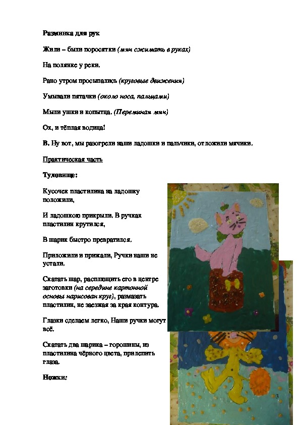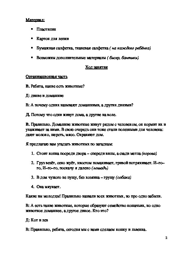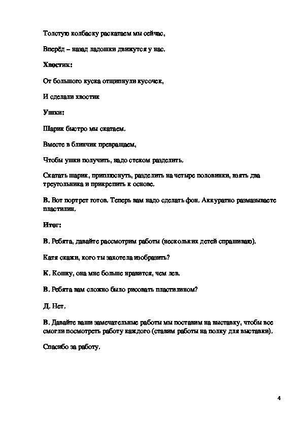 4. Воспитывать аккуратность в работе с пластилином. Вызвать у детей желание делать приятное, дарить подарки.Конспект занятия "Львенок и кошка"