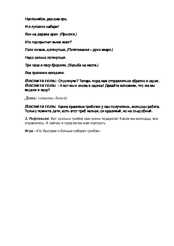 Основная часть (10 мин) Физминутка, «грибы ». Беседа о грибах