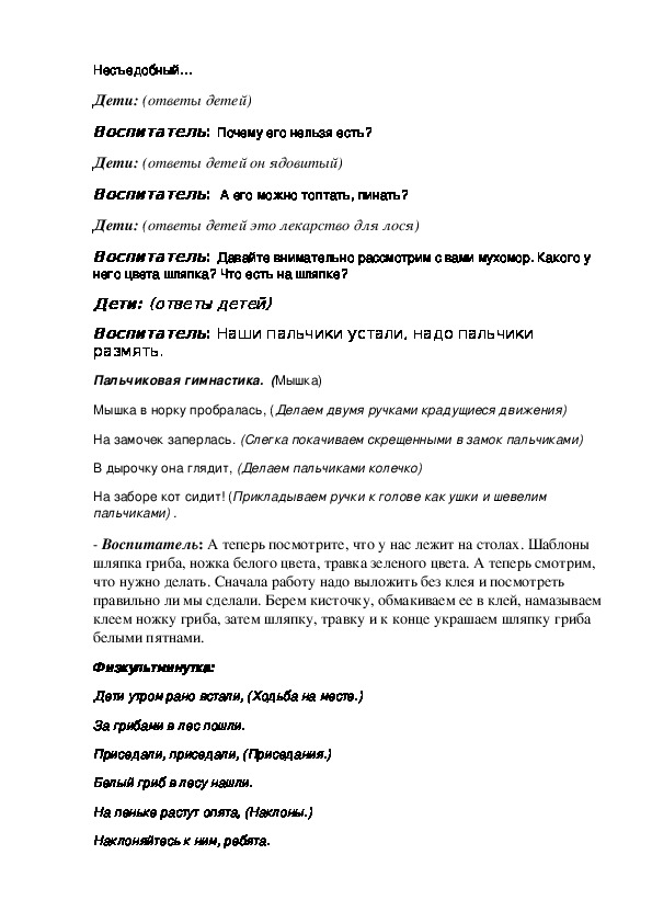 Вводная часть (3 мин.): Создание проблемной ситуации. Задачи: Закрепление знаний детей о несъедобных грибах. Заинтересовать детей выполнением аппликации своими руками.