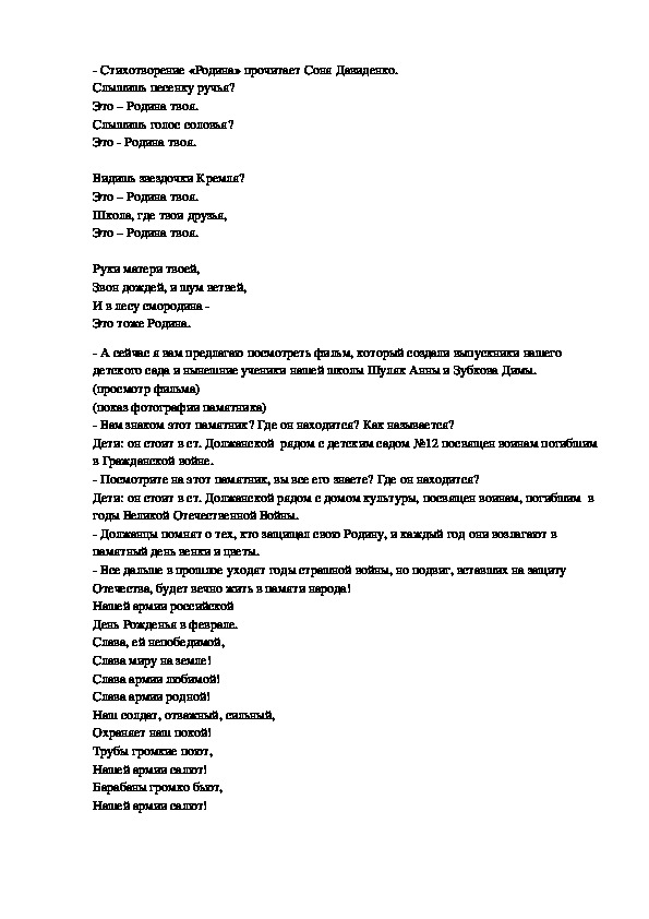 защитниках Отечества в музеях) Стихотворение «Родина» прочитает Соня Давиденко.