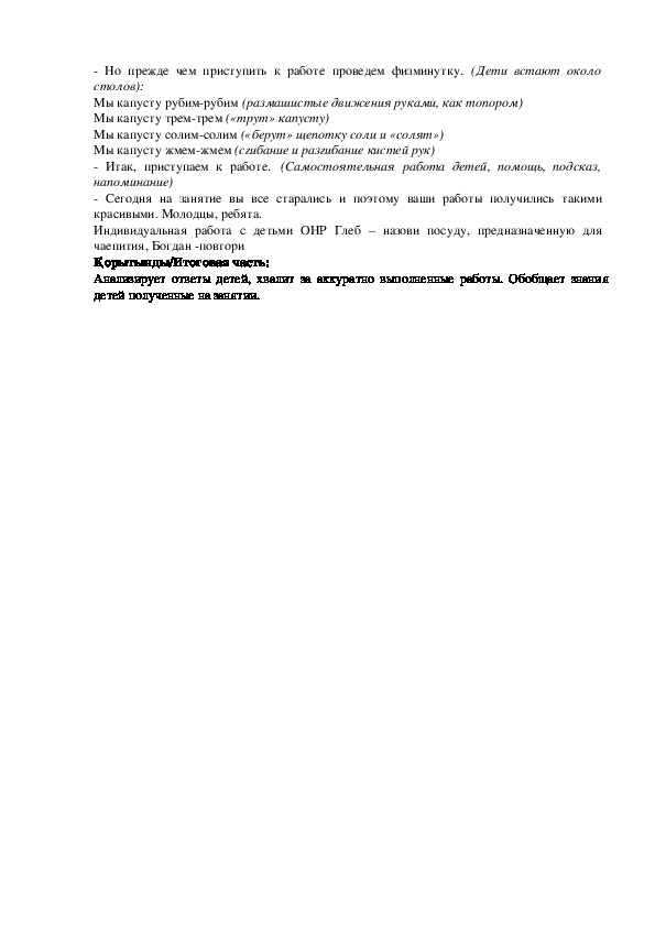 Анализирует ответы детей, хвалит за аккуратно выполненные работы. Обобщает знания