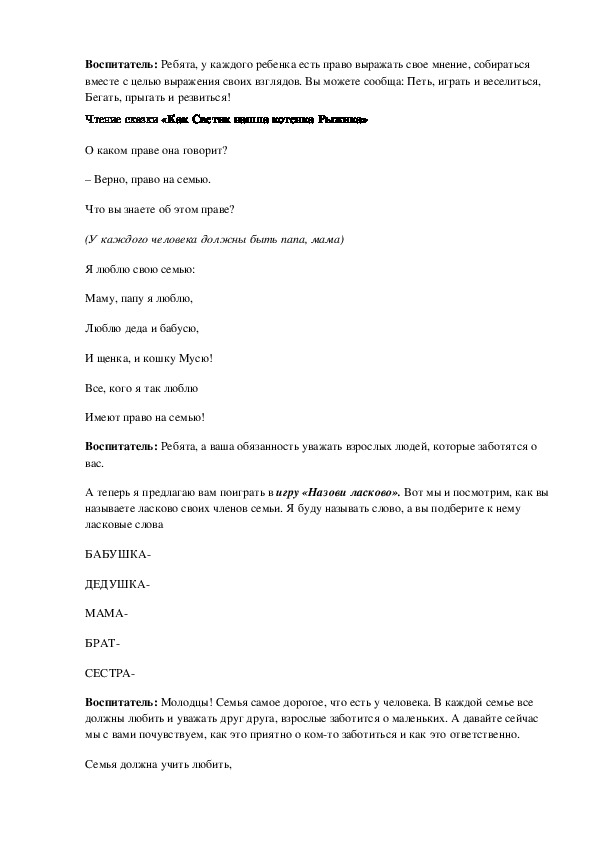 Дети имитируют мытье посуды, стирка белья, уборка по дому и т.д.)Воспитатель: Ребята, у каждого ребенка есть право выражать свое мнение, собираться