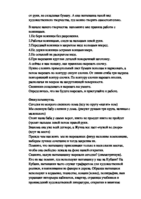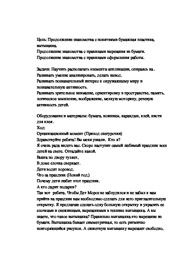 Цель: Продолжение знакомства с понятиями бумажная пластика, вытынанка. Продолжение знакомства с правилами вырезания из бумаги. Продолжение знакомства с правилами оформления работы.