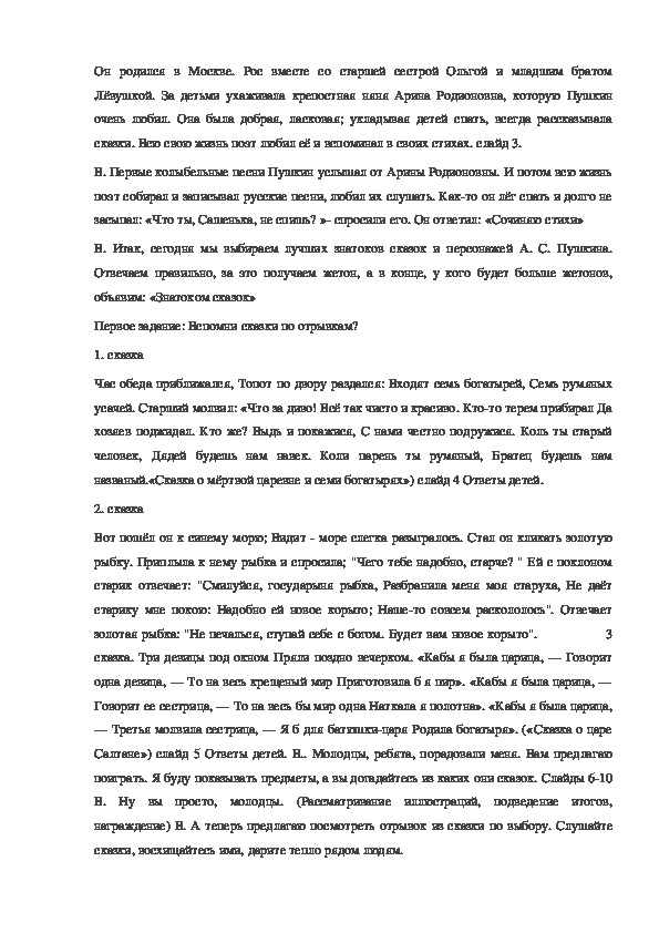 В. Итак, сегодня мы выбираем лучших знатоков сказок и персонажей А. С. Пушкина.