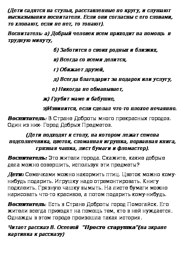 Воспитатель: а) Добрый человек всем приходит на помощь в