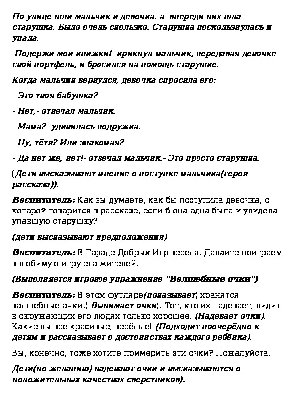 положительных качествах сверстников).Воспитатель: Жители Города Добропорядочного Поведения