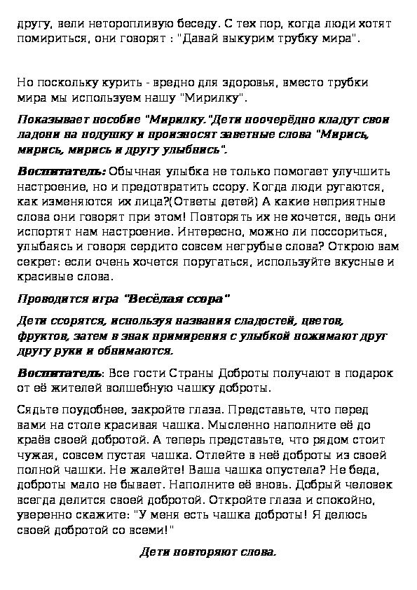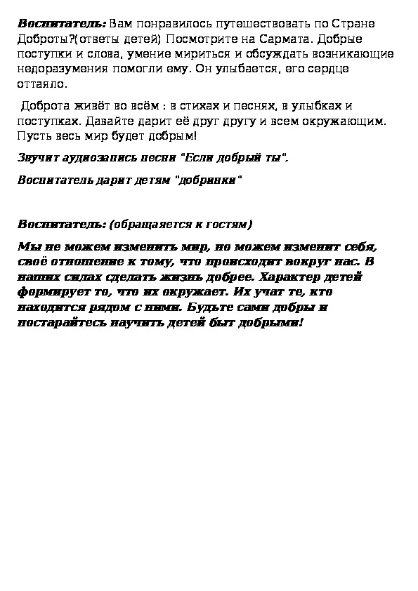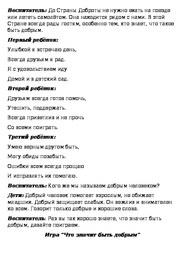 Воспитатель: Предлагаю сегодня отправиться в Страну Доброты. Как вы думаете, что такое доброта? Можно ли увидеть доброту, прикоснуться к ней? Есть ли у неё запах, вкус? В чём проявляется доброта? (ответы детей).