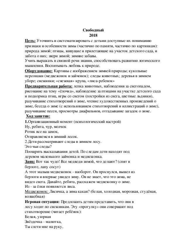 В конспекте предусмотрены элементы театрализованной игры. Дети познакомятся с особенностями проживания животных в зимнее время, познакомятся со следами разных животных. По ходу занятия детям будут загадываться загадки о лесных обитателях.материал для работы в старшей группе
