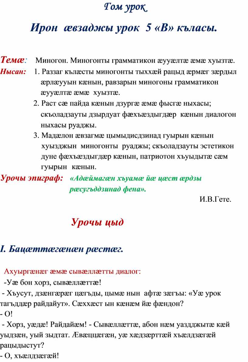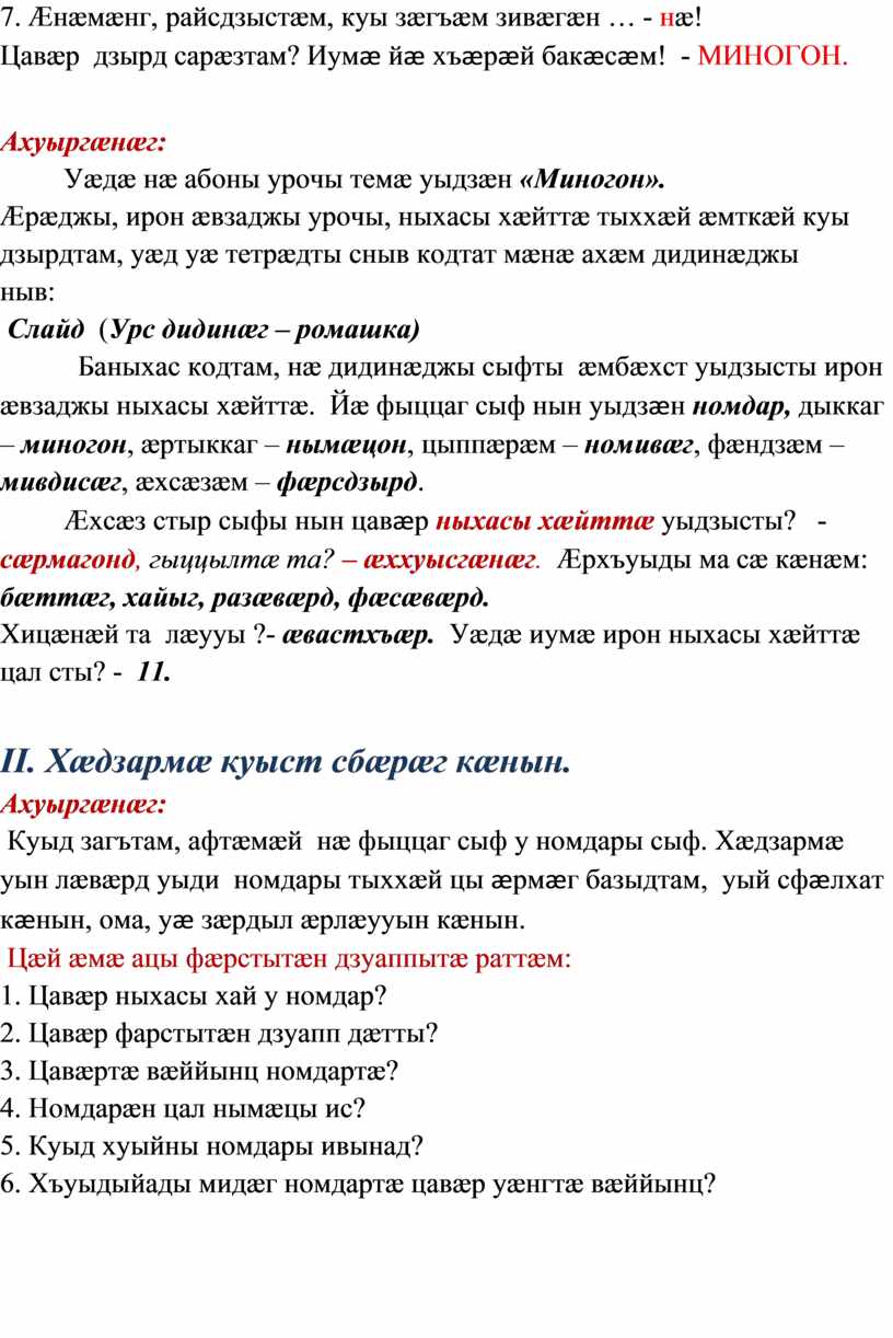 Нæ абоны урочы мах лæмбынæгдæр æрлæудзыстæм нæ дидинæджы дыккаг сыф, дыккаг ныхасы хай – миногоныл. Нæ зæрдыл æрлæууын кæндзыстæм, миногонты тыххæй раздæр кълæсты цы æрмæг базыдтам, уый, дыккаджы та, фæарфдæр кæндзыстæм нæ зонындзинæдтæ миногоны тыххæй, базондзыстæм, цавæр грамматикон æууæлтæ æмæ хуызтæ ис миногонтæн, хъуыдыйады мидæг цавæр уæнгтæ вæййынц, фендзыстæм, куыд аив нын кæнынц не’взаг хуызджын миногонтæ æмæ сæ куыд хъæуы раст пайда кæнын, диалогон ныхасыл бакусдзыстæм.