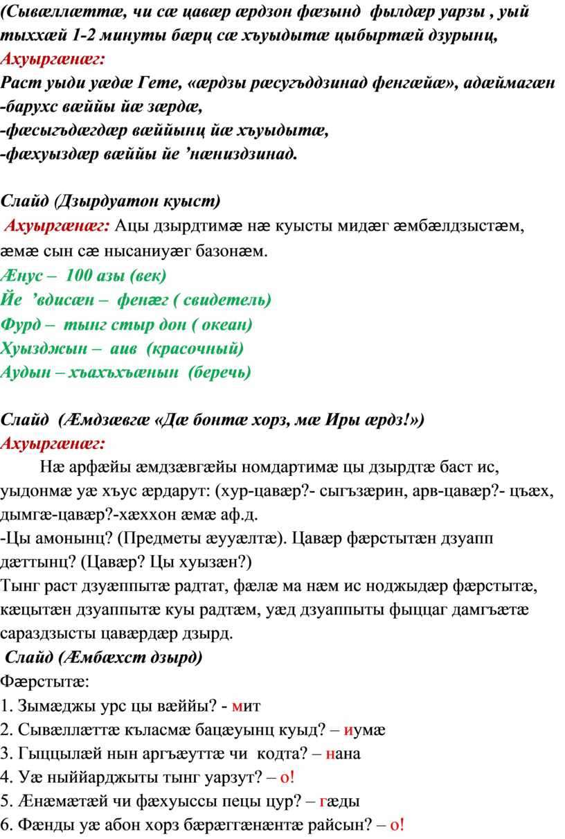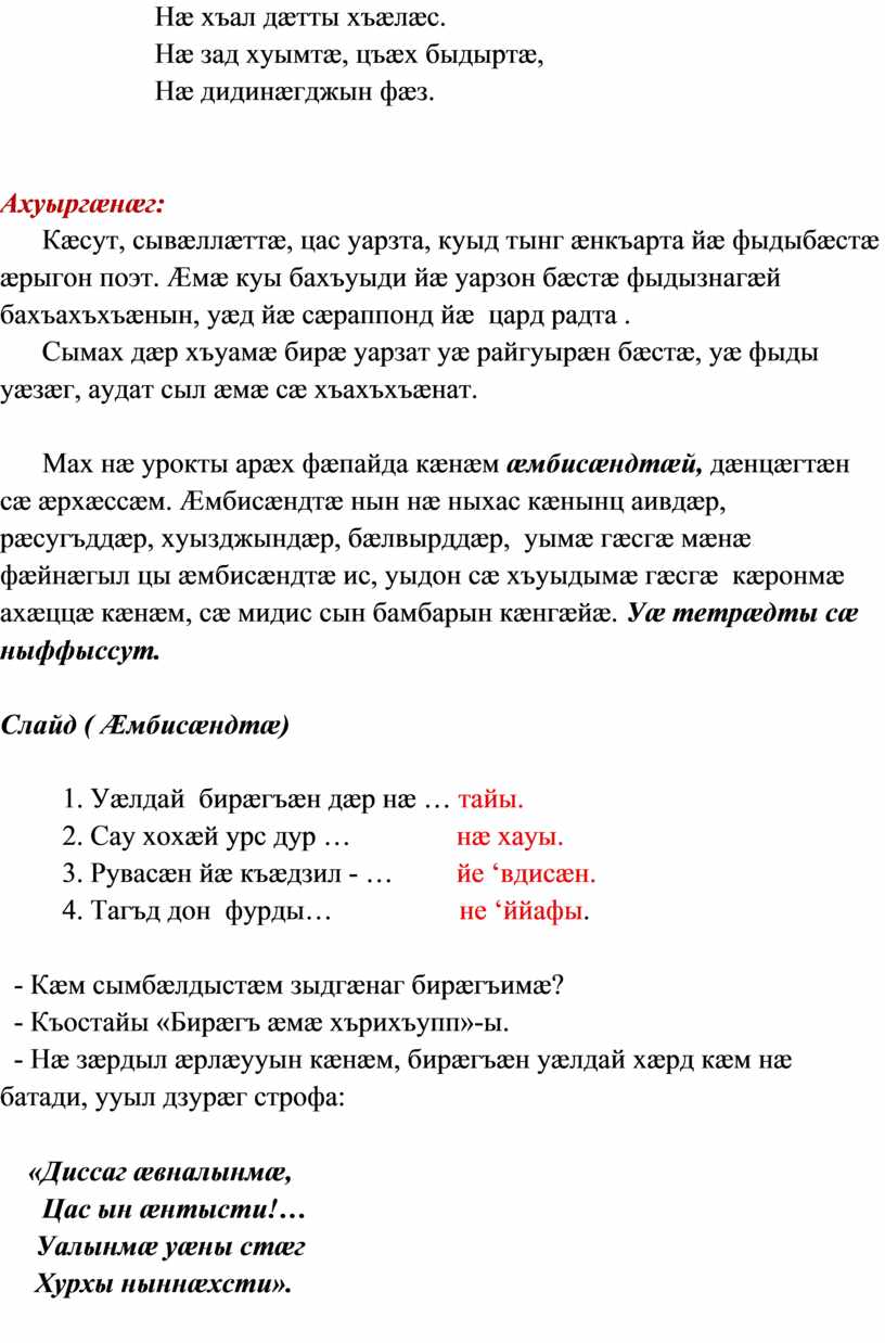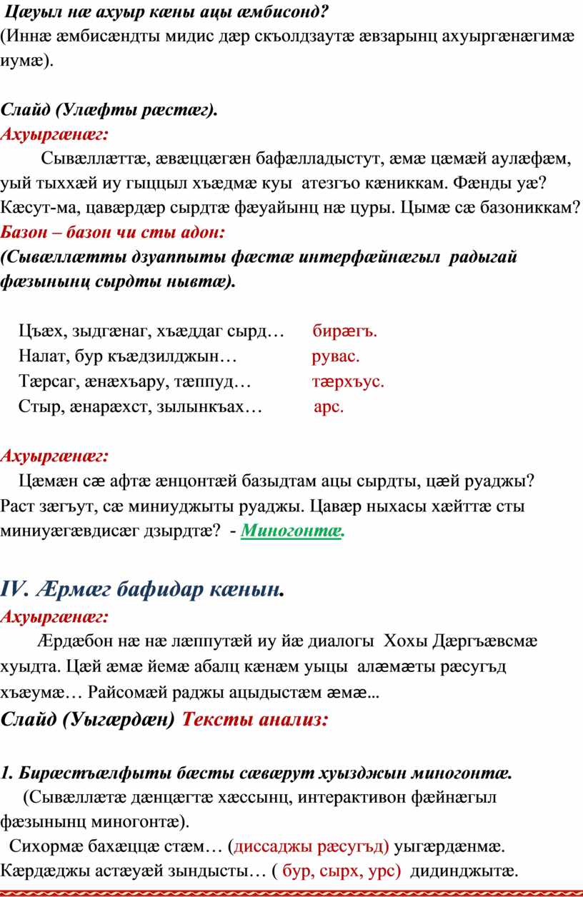 Слайд (Уыгæрдæн) Тексты анализ: