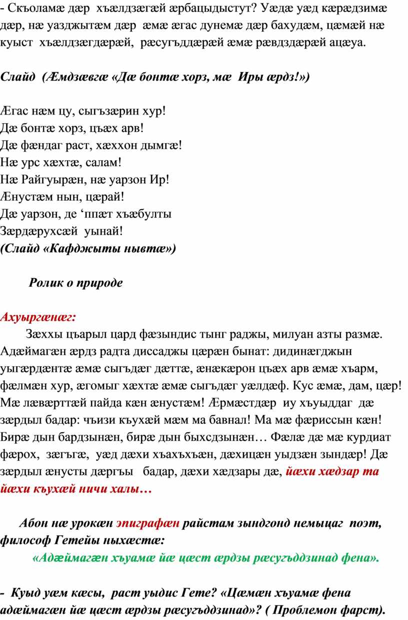 Абон нæ урокæн эпиграфæн райстам зындгонд немыцаг поэт, философ Гетейы ныхæстæ: