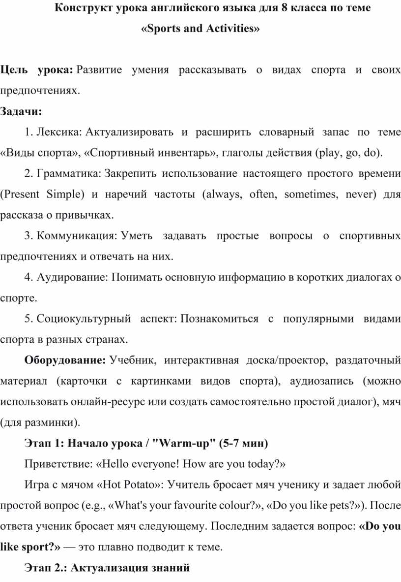 Игра с мячом «Hot Potato»: Учитель бросает мяч ученику и задает любой простой вопрос (e.g., «What's your favourite colour?», «Do you like pets?»). После ответа ученик бросает мяч следующему. Последним задается вопрос: «Do you like sport?» — это плавно подводит к теме.