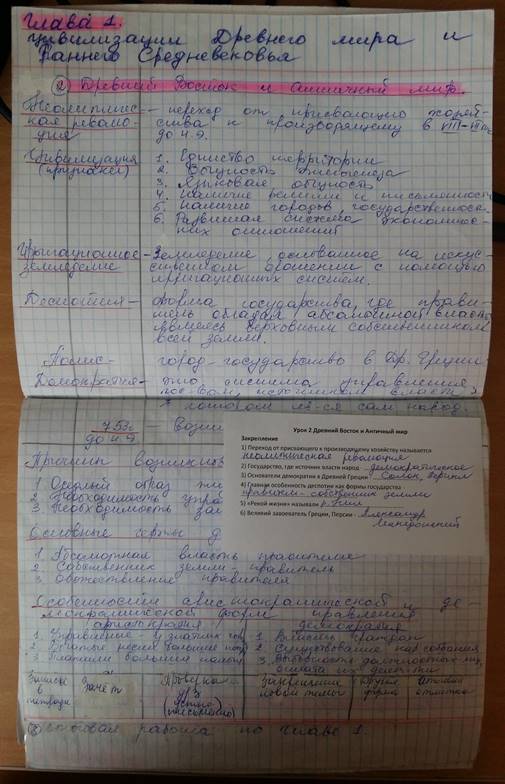 В учебнике «Россия в мире», на мой взгляд, исторический материал представлен хаотично, не выдерживаются чётко хронологические линии, слабо проводится линия и причинно-следственных связей, но это к лучшему – ученики, работая с текстом учебника, самостоятельно устанавливают их. Вопросы к домашнему параграфу я готовлю заранее, ребята записывают их в тетради на отдельной странице и дома, изучая параграф, делают необходимые записи. На уроке обсуждаются их ответы, исправляются ошибки. За эту работу также внизу страницы в тетради выставляются баллы в следующем выделенном столбце.