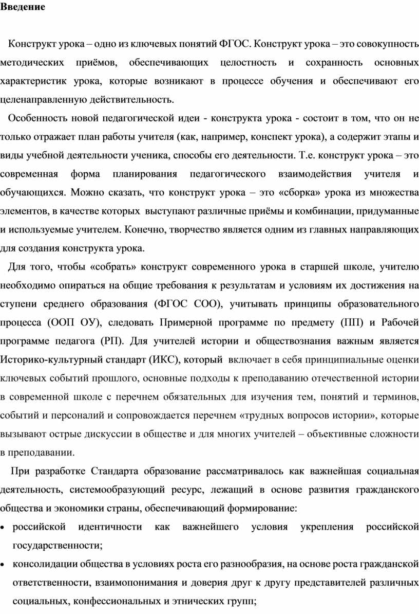 Для того, чтобы «собрать» конструкт современного урока в старшей школе, учителю необходимо опираться на общие требования к результатам и условиям их достижения на ступени среднего образования (ФГОС СОО), учитывать принципы образовательного процесса (ООП ОУ), следовать Примерной программе по предмету (ПП) и Рабочей программе педагога (РП). Для учителей истории и обществознания важным является Историко-культурный стандарт (ИКС), который включает в себя принципиальные оценки ключевых событий прошлого, основные подходы к преподаванию отечественной истории в современной школе с перечнем обязательных для изучения тем, понятий и терминов, событий и персоналий и сопровождается перечнем «трудных вопросов истории», которые вызывают острые дискуссии в обществе и для многих учителей – объективные сложности в преподавании.