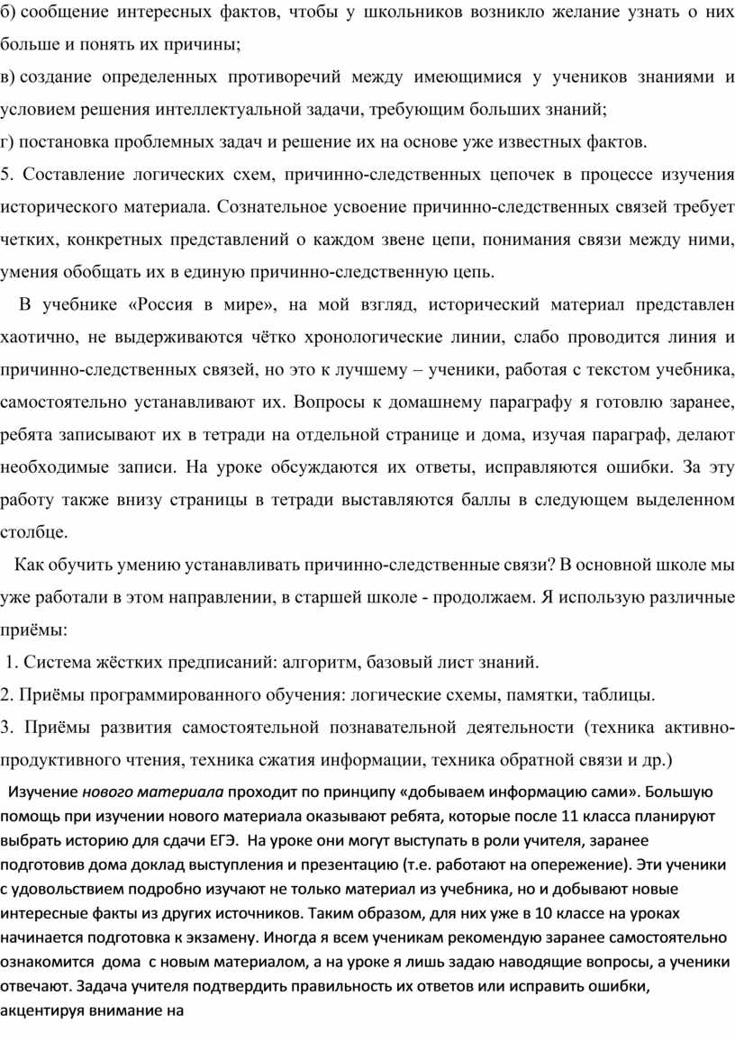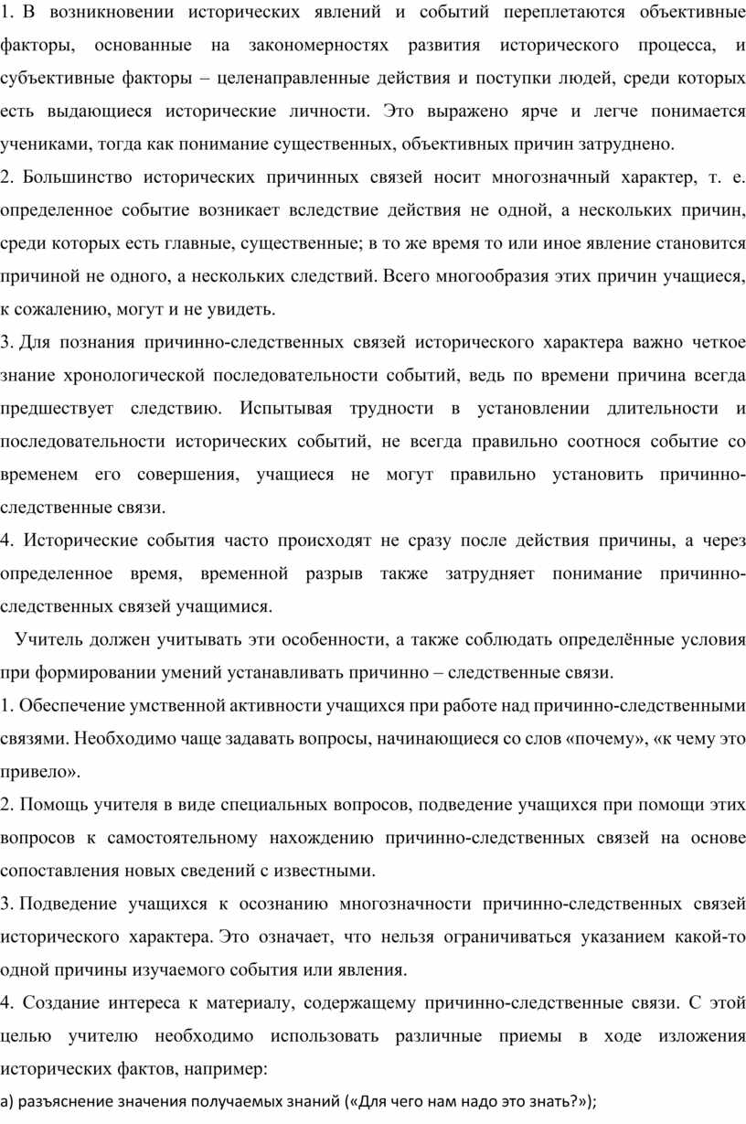 1. Обеспечение умственной активности учащихся при работе над причинно-следственными связями. Необходимо чаще задавать вопросы, начинающиеся со слов «почему», «к чему это привело».