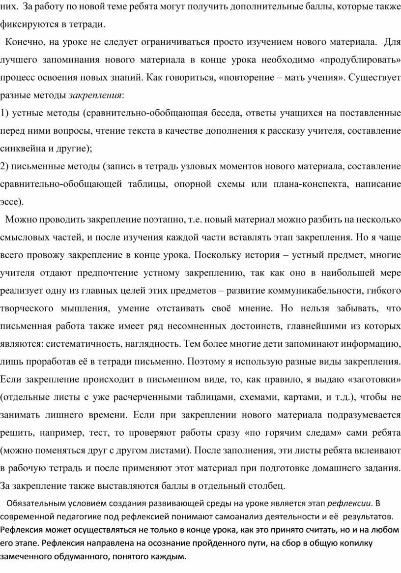 Обязательным условием создания развивающей среды на уроке является этап рефлексии. В современной педагогике под рефлексией понимают самоанализ деятельности и её результатов. Рефлексия может осуществляться не только в конце урока, как это принято считать, но и на любом его этапе. Рефлексия направлена на осознание пройденного пути, на сбор в общую копилку замеченного обдуманного, понятого каждым. Её цель не просто уйти с урока с зафиксированным результатом, а выстроить смысловую цепочку, сравнить способы и методы, применяемые другими со своими.