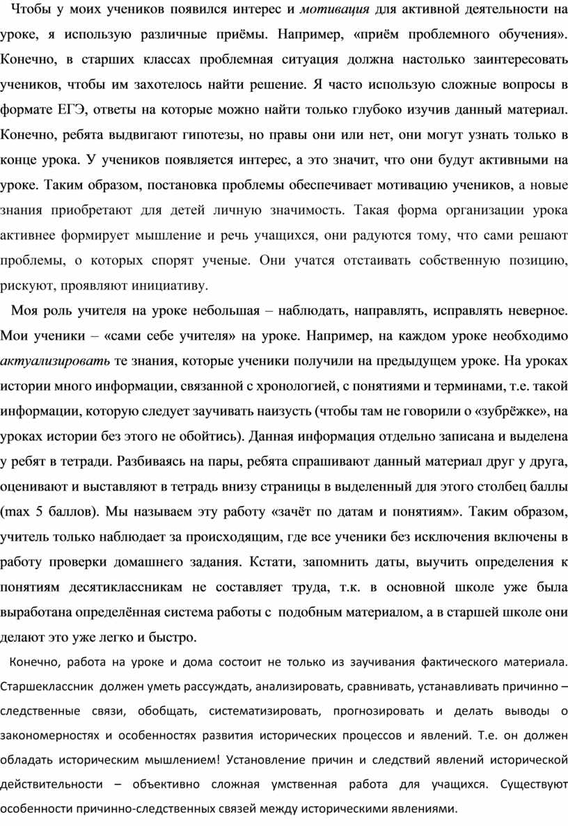 Моя роль учителя на уроке небольшая – наблюдать, направлять, исправлять неверное. Мои ученики – «сами себе учителя» на уроке. Например, на каждом уроке необходимо актуализировать те знания, которые ученики получили на предыдущем уроке. На уроках истории много информации, связанной с хронологией, с понятиями и терминами, т.е. такой информации, которую следует заучивать наизусть (чтобы там не говорили о «зубрёжке», на уроках истории без этого не обойтись). Данная информация отдельно записана и выделена у ребят в тетради. Разбиваясь на пары, ребята спрашивают данный материал друг у друга, оценивают и выставляют в тетрадь внизу страницы в выделенный для этого столбец баллы (max 5 баллов). Мы называем эту работу «зачёт по датам и понятиям». Таким образом, учитель только наблюдает за происходящим, где все ученики без исключения включены в работу проверки домашнего задания. Кстати, запомнить даты, выучить определения к понятиям десятиклассникам не составляет труда, т.к. в основной школе уже была выработана определённая система работы с подобным материалом, а в старшей школе они делают это уже легко и быстро.