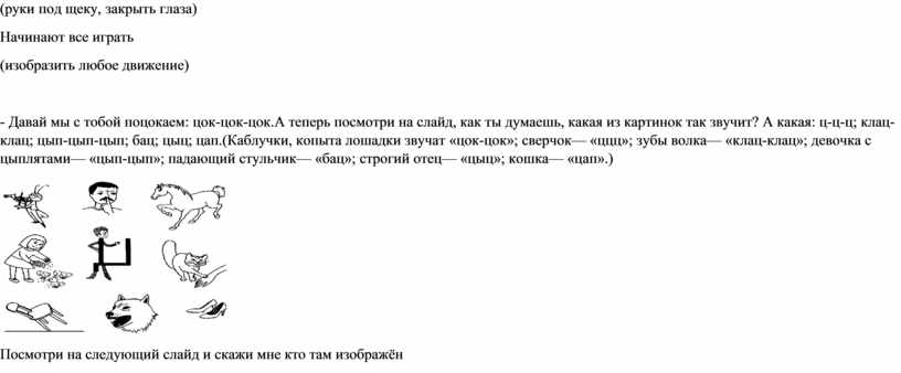 - Давай мы с тобой поцокаем: цок-цок-цок.А теперь посмотри на слайд, как ты думаешь, какая из картинок так звучит? А какая: ц-ц-ц; клац-клац; цып-цып-цып; бац; цыц; цап.(Каблучки, копыта лошадки звучат «цок-цок»; сверчок— «ццц»; зубы волка— «клац-клац»; девочка с цыплятами— «цып-цып»; падающий стульчик— «бац»; строгий отец— «цыц»; кошка— «цап».)
