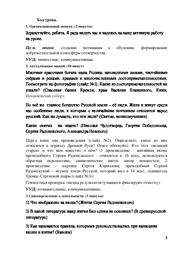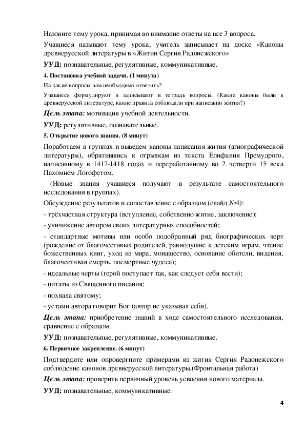 Тема урока: Каноны древнерусской литературы в «Житии Сергия Радонежского» (урок открытия нового знания).
