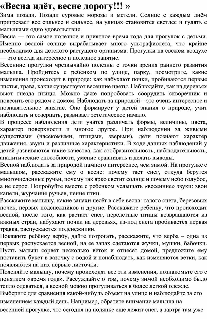 Весна — это самое полезное и приятное время года для прогулок с детьми. Именно весной солнце вырабатывает много ультрафиолета, что крайне необходимо для детского растущего организма. Прогулки на свежем воздухе — это всегда интересное и полезное занятие.