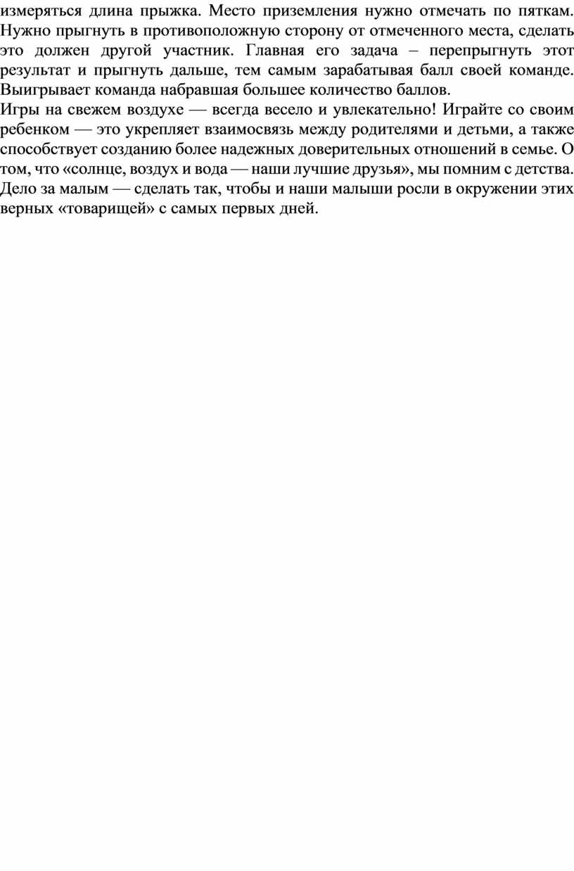 «Развиваем прыгучесть». Для этой игры нужно несколько игроков, следует поделить их на команды. На земле рисуется линия, с помощью которой будет измеряться длина прыжка. Место приземления нужно отмечать по пяткам. Нужно прыгнуть в противоположную сторону от отмеченного места, сделать это должен другой участник. Главная его задача – перепрыгнуть этот результат и прыгнуть дальше, тем самым зарабатывая балл своей команде. Выигрывает команда набравшая большее количество баллов.