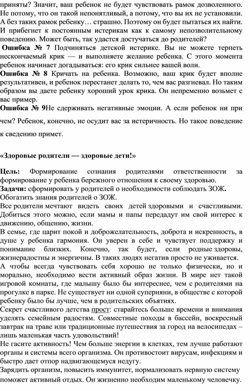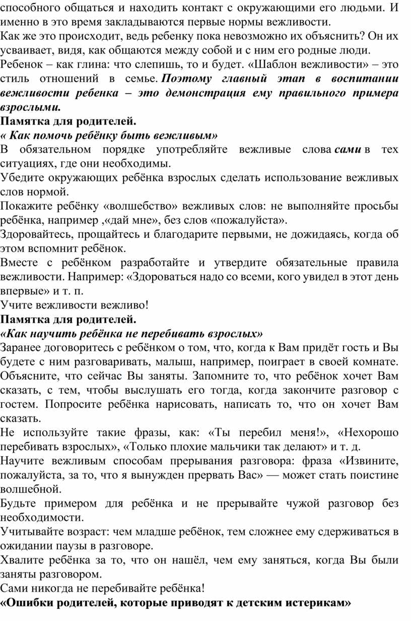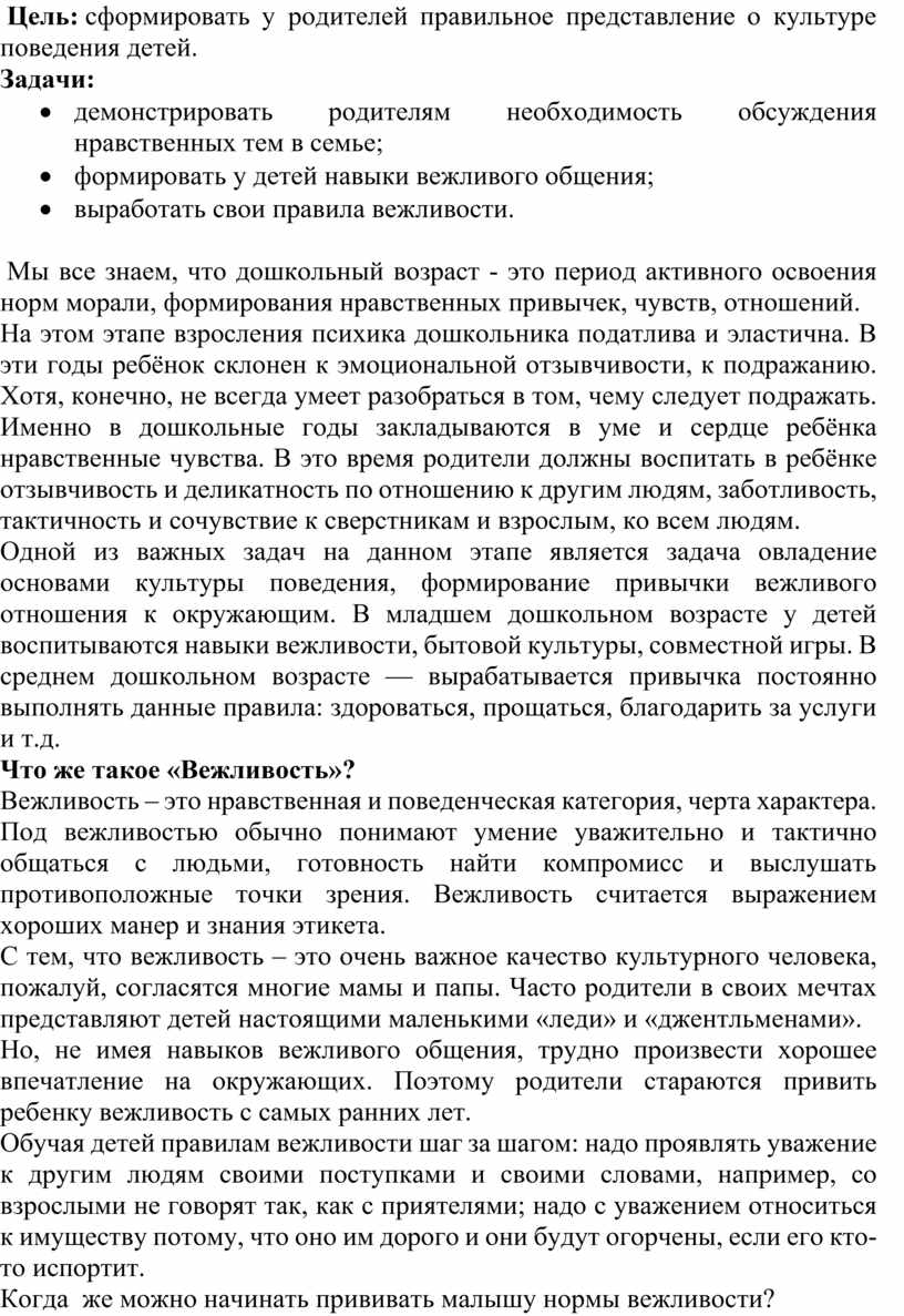 Цель: сформировать у родителей правильное представление о культуре поведения детей.