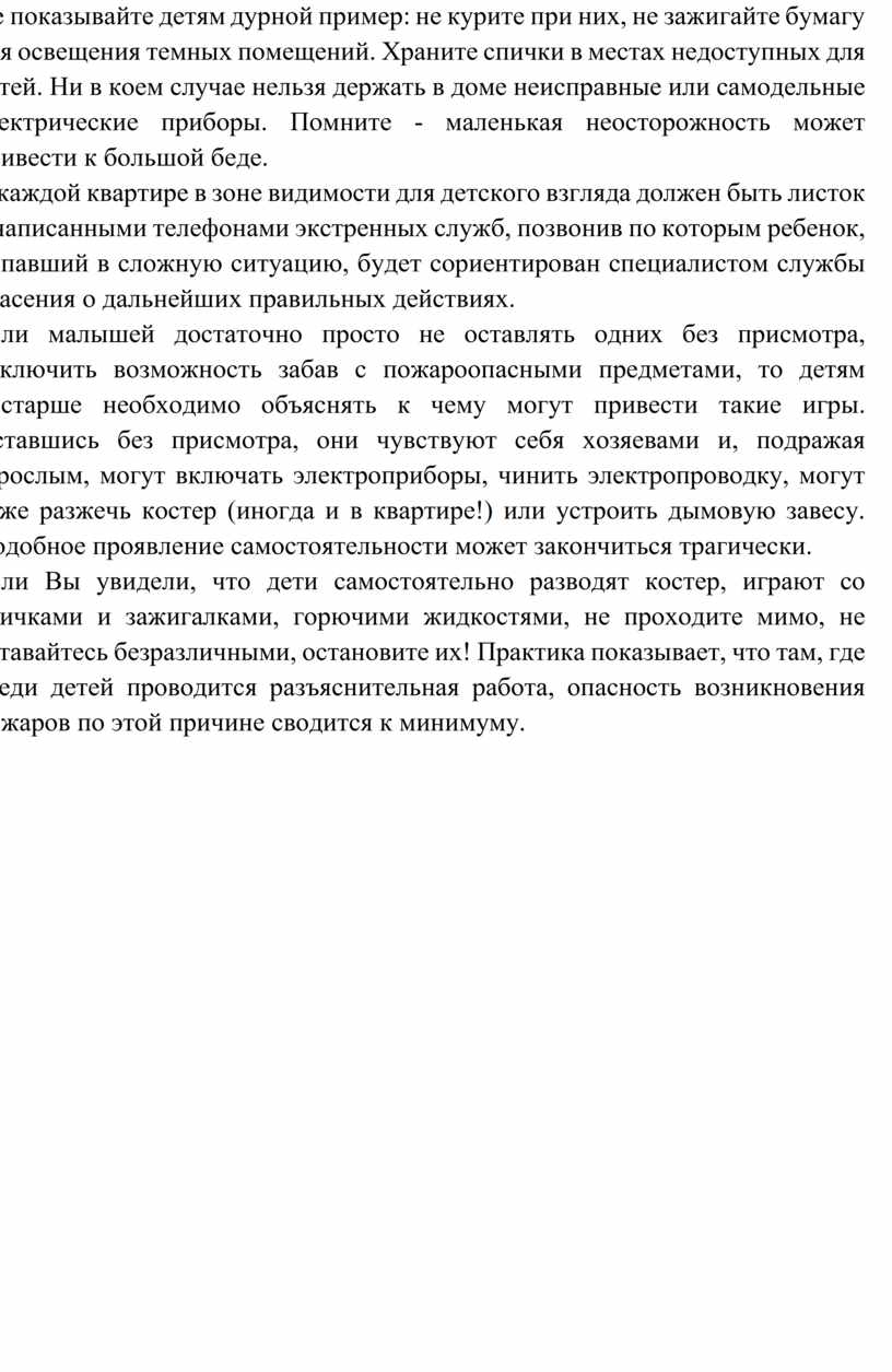 Не показывайте детям дурной пример: не курите при них, не зажигайте бумагу для освещения темных помещений. Храните спички в местах недоступных для детей. Ни в коем случае нельзя держать в доме неисправные или самодельные электрические приборы. Помните - маленькая неосторожность может привести к большой беде.