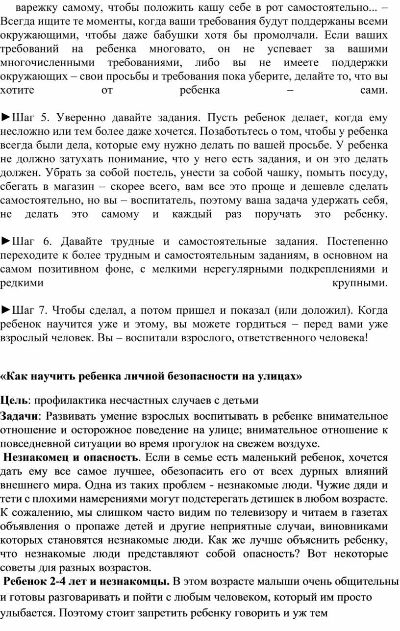 Ребенок 5-7 лет. В этом возрасте ребенок сам может отличить, что хорошо, что плохо, где правда, и где ложь. Но, конечно же, не на взрослом уровне. В этом случае попробуйте объяснить ему, что нельзя разговаривать с незнакомцами на примере. Это могут быть даже мультфильмы. Например, "Три поросенка", "Волк и семеро козлят". В этом возрасте дети не только гуляют на улице на расстоянии со взрослым, но и часто остаются дома одни, что на руку квартирным ворам. Почаще рассказывайте ребенку случаи из жизни, читайте ему хронику происшествий. Научите сына или дочь хотя бы держать дистанцию при случайном разговоре с незнакомым человеком - не менее двух метров, чтобы в случае чего ребенок мог просто убежать.