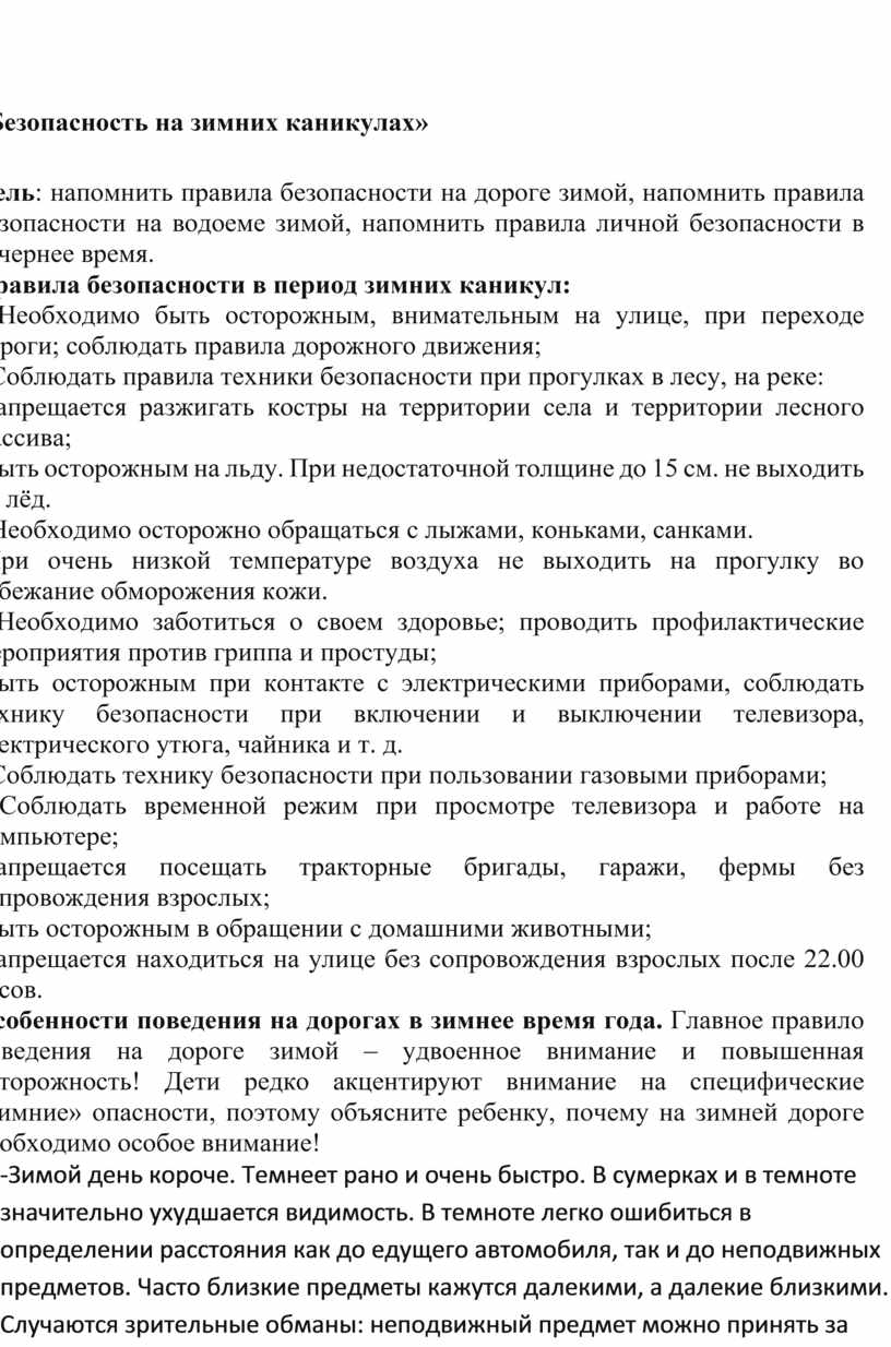 Цель: напомнить правила безопасности на дороге зимой, напомнить правила безопасности на водоеме зимой, напомнить правила личной безопасности в вечернее время.