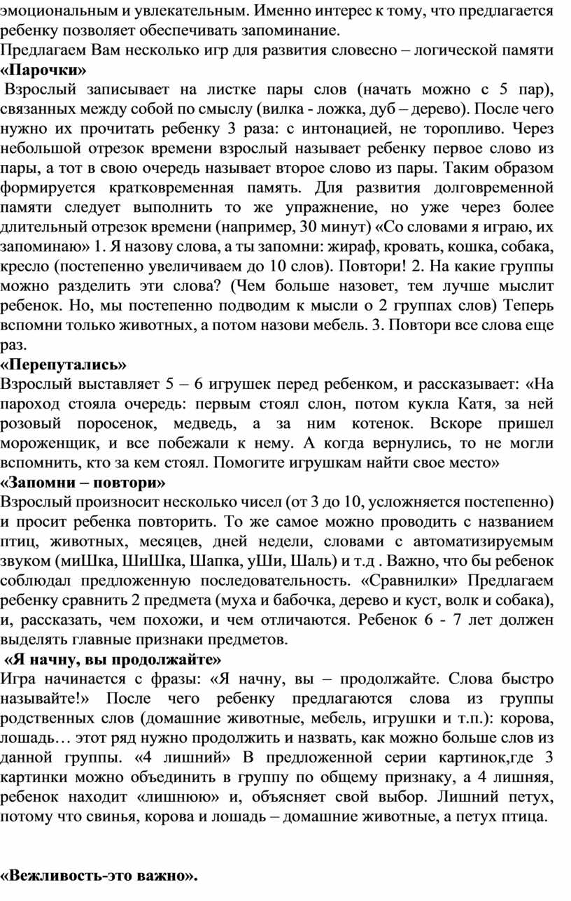 Память – это психический процесс, который обеспечивает человека способностью накапливать, сохранять и воспроизводить знания и навыки. Кратковременная память - это хранилище для небольших порций информации. Если она не имеет большого значения, то соответственно быстро забывается. Благодаря, именно кратковременной памяти, мы строим мыслительные процессы. Долговременная память – хранилище важной информации (все, что вы знаете о мире). Специалисты утверждают, что она безгранична, и, чем шире кругозор человека, тем легче он запоминает новые данные. Существует несколько видов памяти, в зависимости от того, как легче человеку воспринимать информацию: моторная, слуховая, зрительная, вербальная (словесная), логическая. Очень часто виды памяти выступают в определенных сочетаниях: Зрительно – моторная необходима для выполнения работы по образцу: списывание с доски, работа в тетради; Вербально – моторная – работа по словесной инструкции с указанием порядка заданий, написание под диктовку; Словесно - логическая память – позволяет запоминать последовательность слов, действий в рассказах, своих мыслей в процессе, а затем воспроизводить их . Данному виду памяти принадлежит основная роль в усвоении знаний детьми в процессе обучения. Поскольку у детей дошкольного возраста преобладает непроизвольное запоминание (запоминание без цели) нужно помнить: - лучше сохранится тот материал, который ребенка удивил, заинтересовал; - хорошо запоминается материал, представленный в соревновательной форме или игре; - цель должна быть эмоционально значима для ребенка – по ее достижению ребенок должен получить похвалу от взрослого или его удивление. К семи годам начинает формироваться произвольная память (т.е ребенок начинает запоминать сознательно), это связано с физиологией. Полезно знать: - разучивание похожего материала стирает предыдущий, поэтому перед тем, как приступить к изучению нового необходимо сменить вид деятельности или сделать «переменку»; - для лучшего запоминания - лучше учить на ночь; - для лучшего запоминания задаются различные вопросы, типа: «Что про это говорится?» Развитие памяти в дошкольном возрасте имеет огромное значение, в первую очередь для успешного обучения в школе, способности осваивать учебную программу. Поскольку в дошкольном возрасте ведущая роль отводится игре, то с ее помощью и стоит проводить работу по развитию памяти. Благодаря ей мы сможем простимулировать детскую активность, увеличить объем словесно - логической памяти, а также сделаем процесс обучения более эмоциональным и увлекательным. Именно интерес к тому, что предлагается ребенку позволяет обеспечивать запоминание.