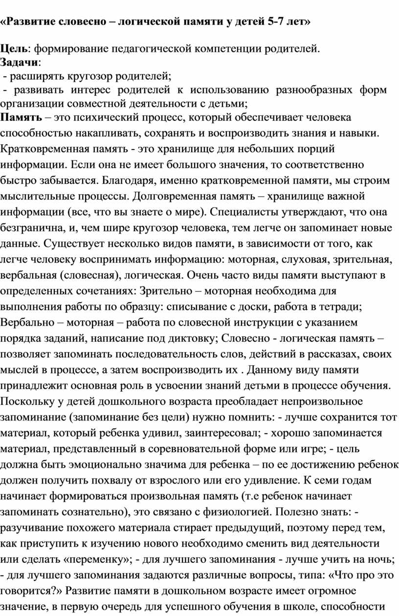 «Развитие словесно – логической памяти у детей 5-7 лет»