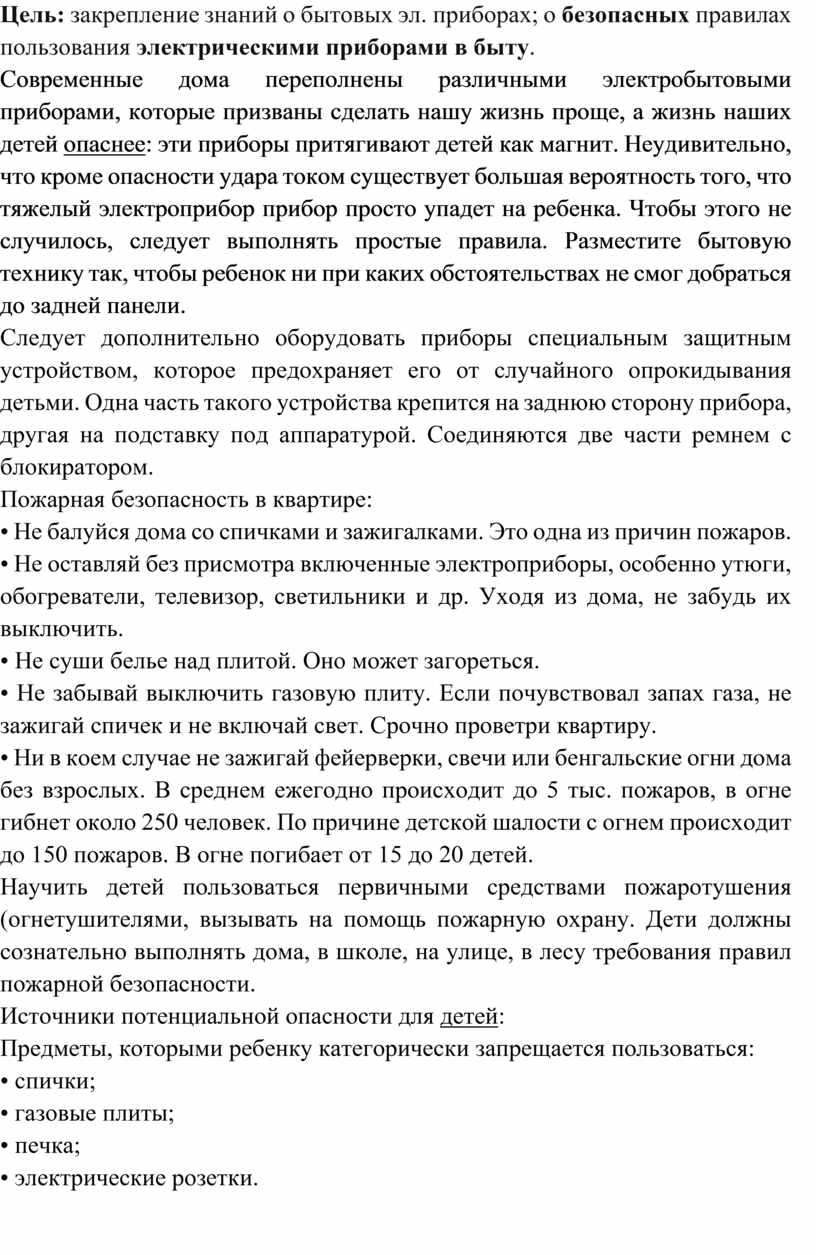 Цель: закрепление знаний о бытовых эл. приборах; о безопасных правилах пользования электрическими приборами в быту.