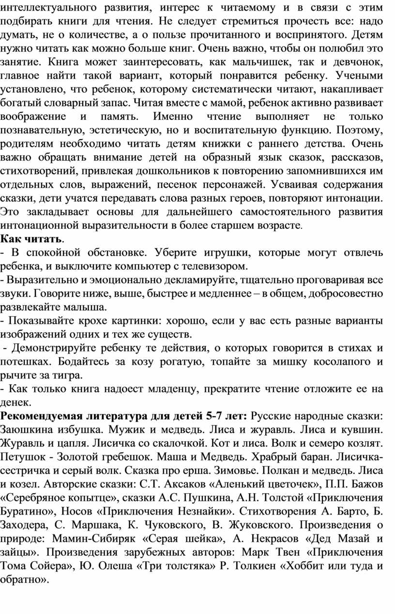 Рекомендуемая литература для детей 5-7 лет: Русские народные сказки: Заюшкина избушка. Мужик и медведь. Лиса и журавль. Лиса и кувшин. Журавль и цапля. Лисичка со скалочкой. Кот и лиса. Волк и семеро козлят. Петушок - Золотой гребешок. Маша и Медведь. Храбрый баран. Лисичка-сестричка и серый волк. Сказка про ерша. Зимовье. Полкан и медведь. Лиса и козел. Авторские сказки: С.Т. Аксаков «Аленький цветочек», П.П. Бажов «Серебряное копытце», сказки А.С. Пушкина, А.Н. Толстой «Приключения Буратино», Носов «Приключения Незнайки». Стихотворения А. Барто, Б. Заходера, С. Маршака, К. Чуковского, В. Жуковского. Произведения о природе: Мамин-Сибиряк «Серая шейка», А. Некрасов «Дед Мазай и зайцы». Произведения зарубежных авторов: Марк Твен «Приключения Тома Сойера», Ю. Олеша «Три толстяка» Р. Толкиен «Хоббит или туда и обратно».
