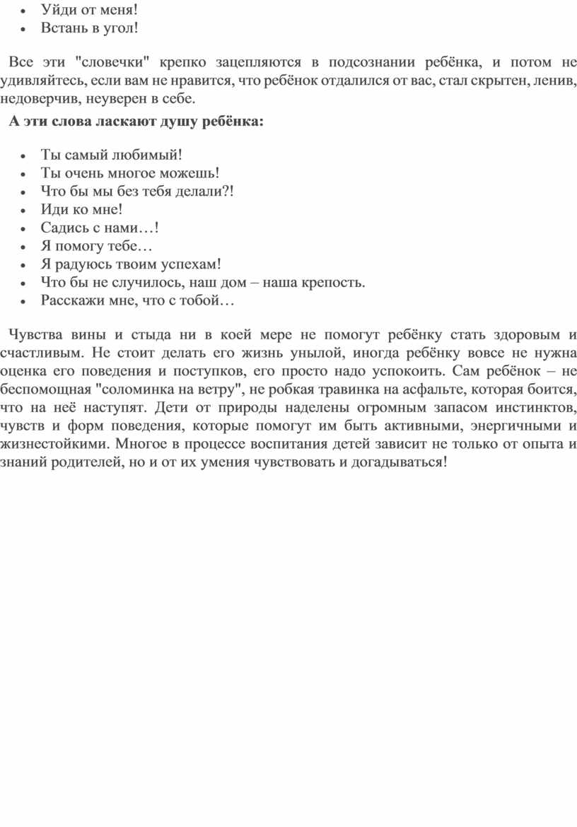 Чувства вины и стыда ни в коей мере не помогут ребёнку стать здоровым и счастливым. Не стоит делать его жизнь унылой, иногда ребёнку вовсе не нужна оценка его поведения и поступков, его просто надо успокоить. Сам ребёнок – не беспомощная "соломинка на ветру", не робкая травинка на асфальте, которая боится, что на неё наступят. Дети от природы наделены огромным запасом инстинктов, чувств и форм поведения, которые помогут им быть активными, энергичными и жизнестойкими. Многое в процессе воспитания детей зависит не только от опыта и знаний родителей, но и от их умения чувствовать и догадываться!