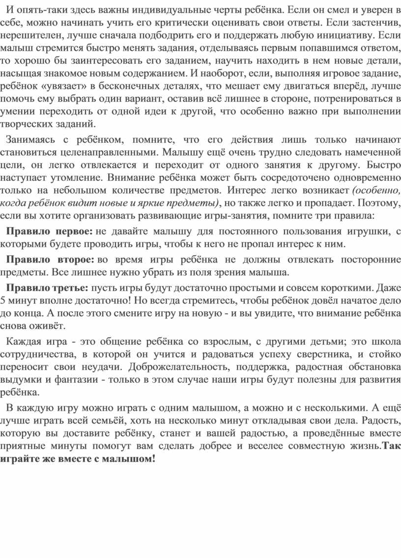 Организуя игры с ребёнком, внимательно присмотритесь к нему, оцените его индивидуальные особенности. Если он быстро и легко справляется с заданиями, можно предлагать ему более сложные и, наоборот, в случае затруднений, лучше подольше задержаться на простых. Ни в коем случае нельзя форсировать выполнение заданий, упрекать малыша в том, что он что-либо не умеет, даже если это с лёгкостью делают его сверстники.