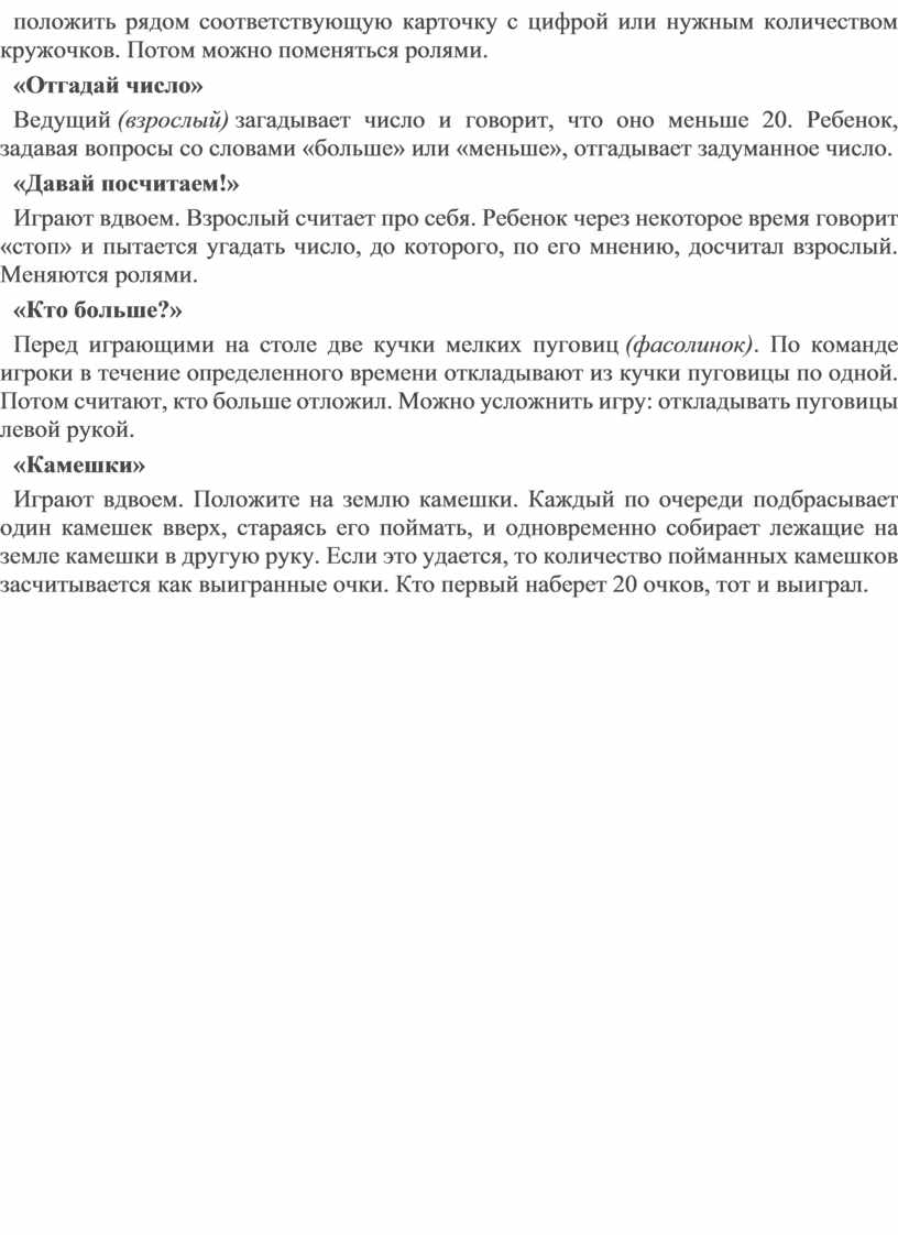 Ведущий (взрослый) загадывает число и говорит, что оно меньше 20. Ребенок, задавая вопросы со словами «больше» или «меньше», отгадывает задуманное число.