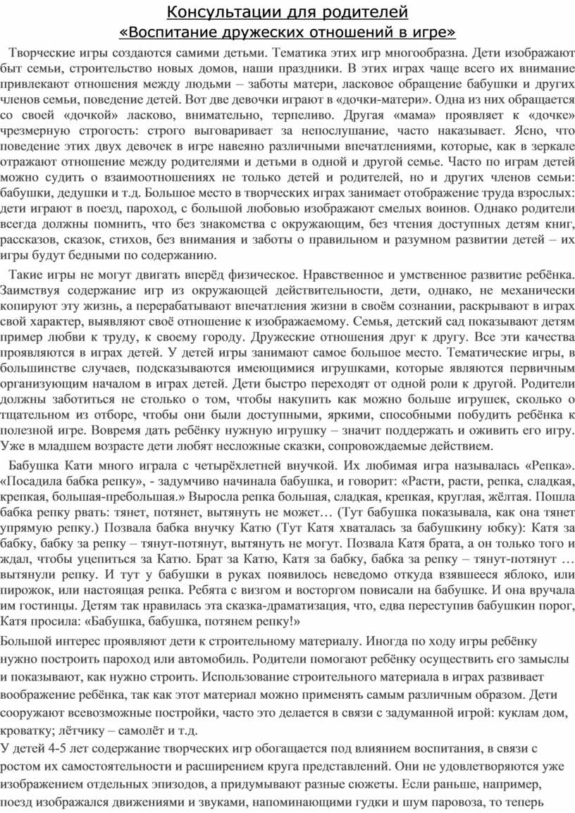 Творческие игры создаются самими детьми. Тематика этих игр многообразна. Дети изображают быт семьи, строительство новых домов, наши праздники. В этих играх чаще всего их внимание привлекают отношения между людьми – заботы матери, ласковое обращение бабушки и других членов семьи, поведение детей. Вот две девочки играют в «дочки-матери». Одна из них обращается со своей «дочкой» ласково, внимательно, терпеливо. Другая «мама» проявляет к «дочке» чрезмерную строгость: строго выговаривает за непослушание, часто наказывает. Ясно, что поведение этих двух девочек в игре навеяно различными впечатлениями, которые, как в зеркале отражают отношение между родителями и детьми в одной и другой семье. Часто по играм детей можно судить о взаимоотношениях не только детей и родителей, но и других членов семьи: бабушки, дедушки и т.д. Большое место в творческих играх занимает отображение труда взрослых: дети играют в поезд, пароход, с большой любовью изображают смелых воинов. Однако родители всегда должны помнить, что без знакомства с окружающим, без чтения доступных детям книг, рассказов, сказок, стихов, без внимания и заботы о правильном и разумном развитии детей – их игры будут бедными по содержанию.