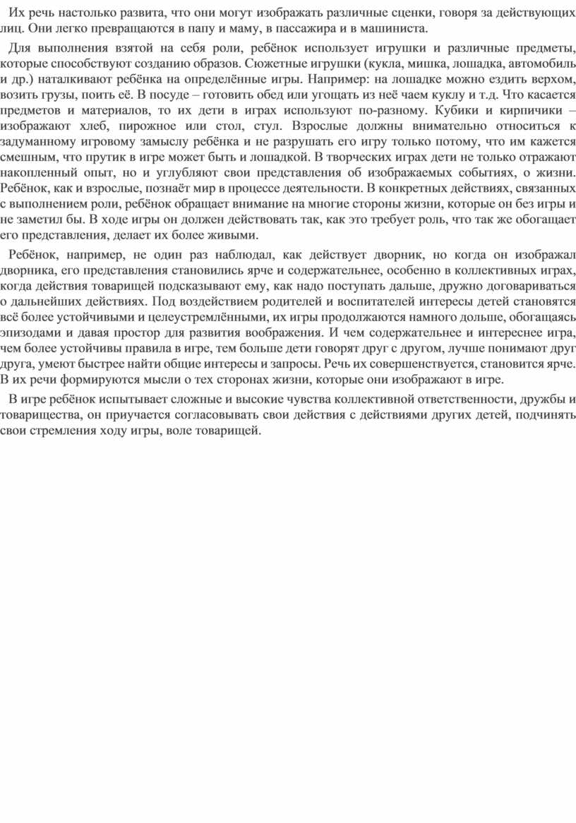 Ребёнок, например, не один раз наблюдал, как действует дворник, но когда он изображал дворника, его представления становились ярче и содержательнее, особенно в коллективных играх, когда действия товарищей подсказывают ему, как надо поступать дальше, дружно договариваться о дальнейших действиях. Под воздействием родителей и воспитателей интересы детей становятся всё более устойчивыми и целеустремлёнными, их игры продолжаются намного дольше, обогащаясь эпизодами и давая простор для развития воображения. И чем содержательнее и интереснее игра, чем более устойчивы правила в игре, тем больше дети говорят друг с другом, лучше понимают друг друга, умеют быстрее найти общие интересы и запросы. Речь их совершенствуется, становится ярче. В их речи формируются мысли о тех сторонах жизни, которые они изображают в игре.