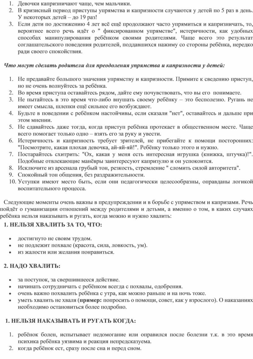 Следующие моменты очень важны в предупреждении и в борьбе с упрямством и капризами. Речь пойдёт о гуманизации отношений между родителями и детьми, а именно о том, в каких случаях ребёнка нельзя наказывать и ругать, когда можно и нужно хвалить: