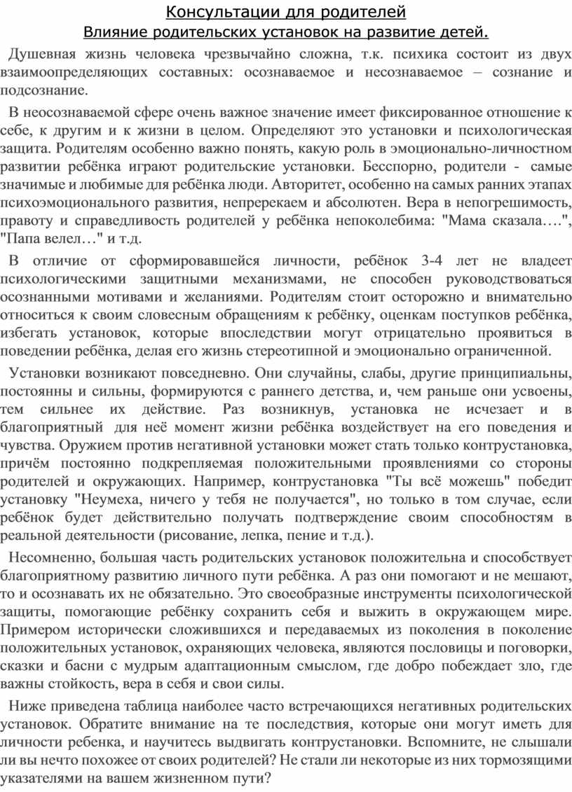 Ниже приведена таблица наиболее часто встречающихся негативных родительских установок. Обратите внимание на те последствия, которые они могут иметь для личности ребенка, и научитесь выдвигать контрустановки. Вспомните, не слышали ли вы нечто похожее от своих родителей? Не стали ли некоторые из них тормозящими указателями на вашем жизненном пути?