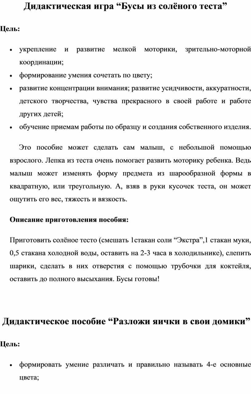 Это пособие может сделать сам малыш, с небольшой помощью взрослого. Лепка из теста очень помогает развить моторику ребенка. Ведь малыш может изменять форму предмета из шарообразной формы в квадратную, или треугольную. А, взяв в руки кусочек теста, он может ощутить его вес, тяжесть и вязкость.