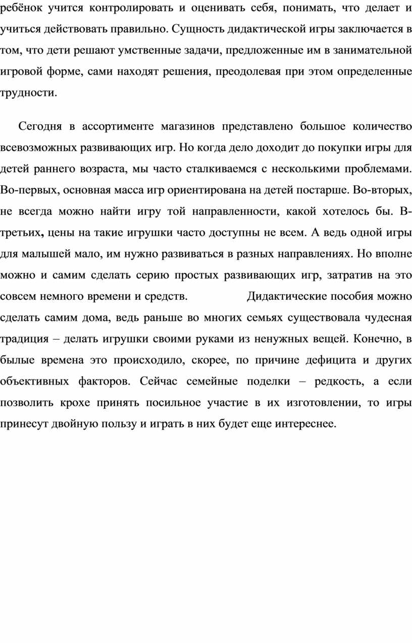 Сегодня в ассортименте магазинов представлено большое количество всевозможных развивающих игр. Но когда дело доходит до покупки игры для детей раннего возраста, мы часто сталкиваемся с несколькими проблемами. Во-первых, основная масса игр ориентирована на детей постарше. Во-вторых, не всегда можно найти игру той направленности, какой хотелось бы. В-третьих, цены на такие игрушки часто доступны не всем. А ведь одной игры для малышей мало, им нужно развиваться в разных направлениях. Но вполне можно и самим сделать серию простых развивающих игр, затратив на это совсем немного времени и средств. Дидактические пособия можно сделать самим дома, ведь раньше во многих семьях существовала чудесная традиция – делать игрушки своими руками из ненужных вещей. Конечно, в былые времена это происходило, скорее, по причине дефицита и других объективных факторов. Сейчас семейные поделки – редкость, а если позволить крохе принять посильное участие в их изготовлении, то игры принесут двойную пользу и играть в них будет еще интереснее.