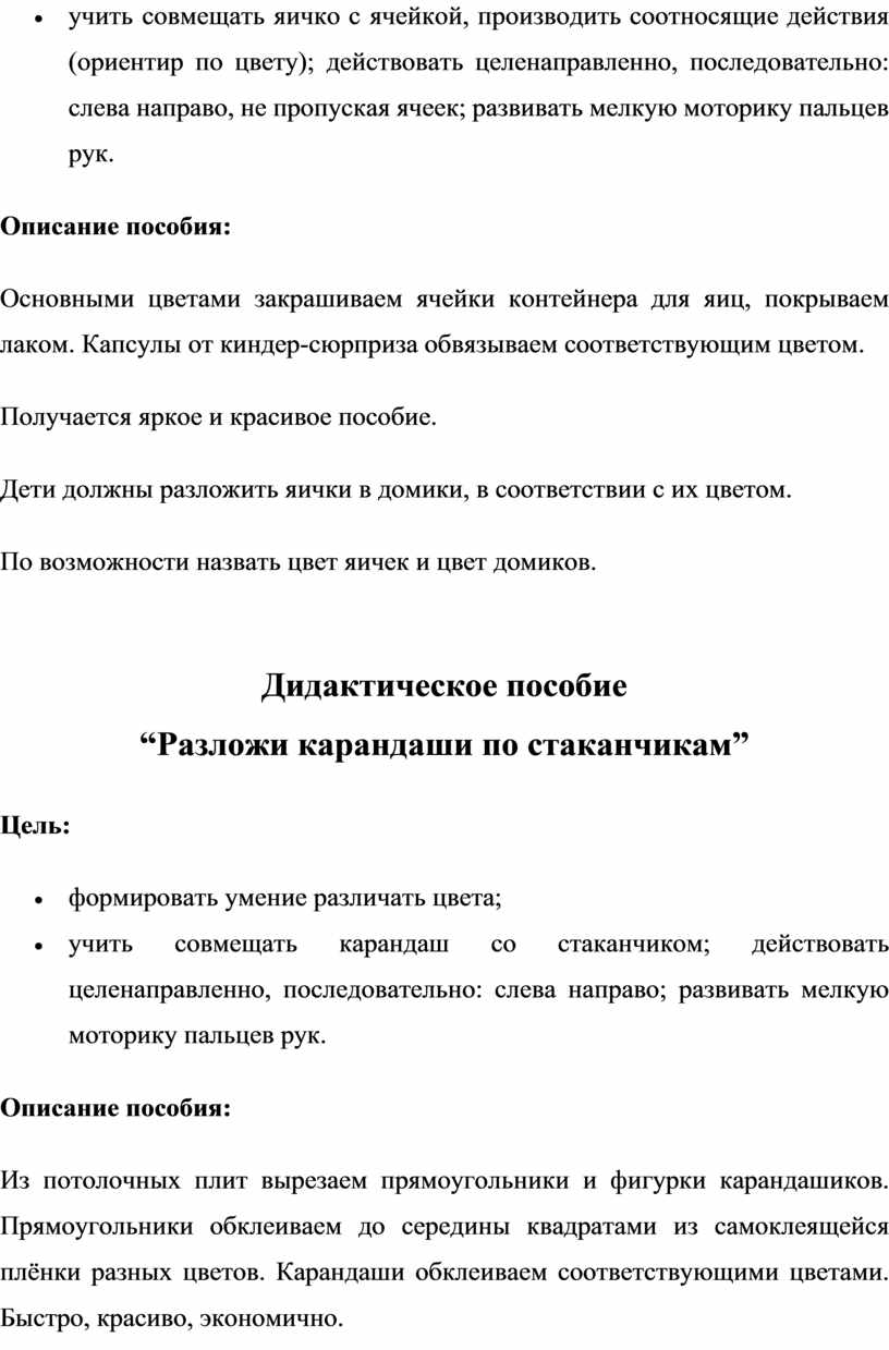 Следовательно, главное в этом возрасте – обогащение чувственного опыта, необходимого для полноценного восприятия окружающего мира, и в первую очередь – пополнение представлений о свойствах предметов: их цвете, форме, величине окружающих предметов, положении в пространстве и т.п.