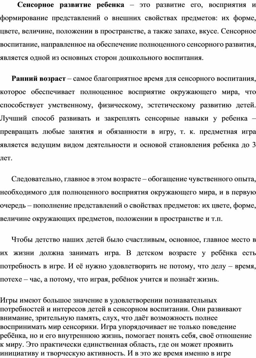 Ранний возраст – самое благоприятное время для сенсорного воспитания, которое обеспечивает полноценное восприятие окружающего мира, что способствует умственному, физическому, эстетическому развитию детей. Лучший способ развивать и закреплять сенсорные навыки у ребенка – превращать любые занятия и обязанности в игру, т. к. предметная игра является ведущим видом деятельности и основой становления ребенка до 3 лет.