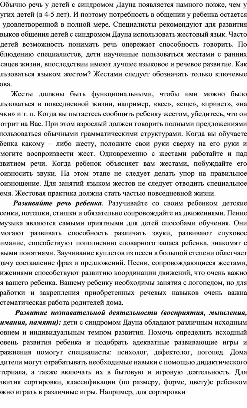 Развитие познавательной деятельности (восприятия, мышления, внимания, памяти): дети с синдромом Дауна обладают различным исходным уровнем и индивидуальным темпом развития. Помочь определить исходный уровень развития ребенка и подобрать адекватные развивающие игры и упражнения помогут специалисты: психолог, дефектолог, логопед. Дома родители могут отрабатывать необходимые навыки с помощью дидактического материала, а также включать их в бытовую и игровую деятельность. Для развития сортировки, классификации (по размеру, форме, цвету)с ребенком можно играть в различные игры. Например, для сортировки