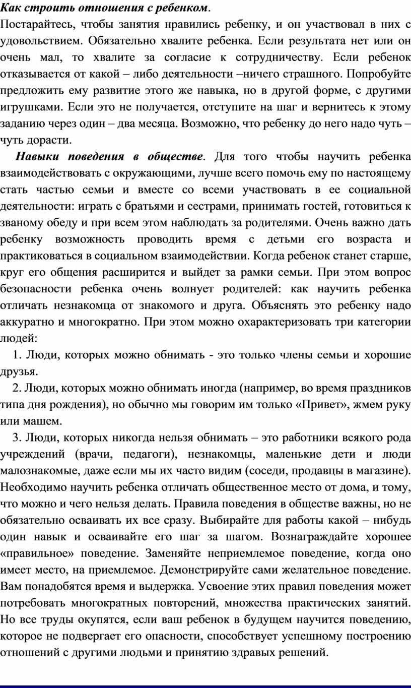 3. Люди, которых никогда нельзя обнимать – это работники всякого рода учреждений (врачи, педагоги), незнакомцы, маленькие дети и люди малознакомые, даже если мы их часто видим (соседи, продавцы в магазине). Необходимо научить ребенка отличать общественное место от дома, и тому, что можно и чего нельзя делать. Правила поведения в обществе важны, но не обязательно осваивать их все сразу. Выбирайте для работы какой – нибудь один навык и осваивайте его шаг за шагом. Вознаграждайте хорошее «правильное» поведение. Заменяйте неприемлемое поведение, когда оно имеет место, на приемлемое. Демонстрируйте сами желательное поведение. Вам понадобятся время и выдержка. Усвоение этих правил поведения может потребовать многократных повторений, множества практических занятий. Но все труды окупятся, если ваш ребенок в будущем научится поведению, которое не подвергает его опасности, способствует успешному построению отношений с другими людьми и принятию здравых решений.