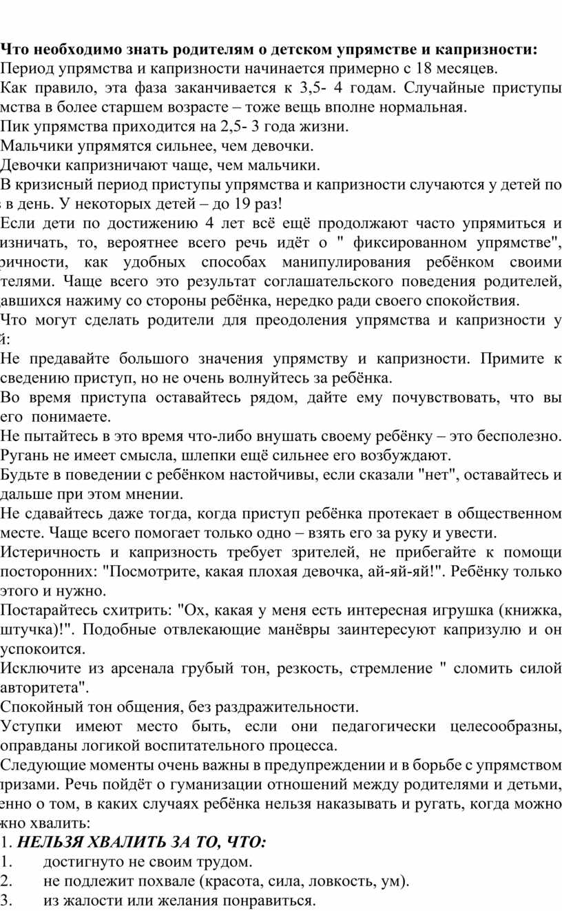 Следующие моменты очень важны в предупреждении и в борьбе с упрямством и капризами. Речь пойдёт о гуманизации отношений между родителями и детьми, а именно о том, в каких случаях ребёнка нельзя наказывать и ругать, когда можно и нужно хвалить: