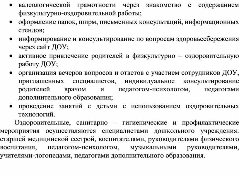 · проводится целенаправленная работа, пропагандирующая общегигиенические требования, необходимость рационального режима, полноценного питания, закаливания, формирования основ валеологической грамотности через знакомство с содержанием физкультурно-оздоровительной работы;