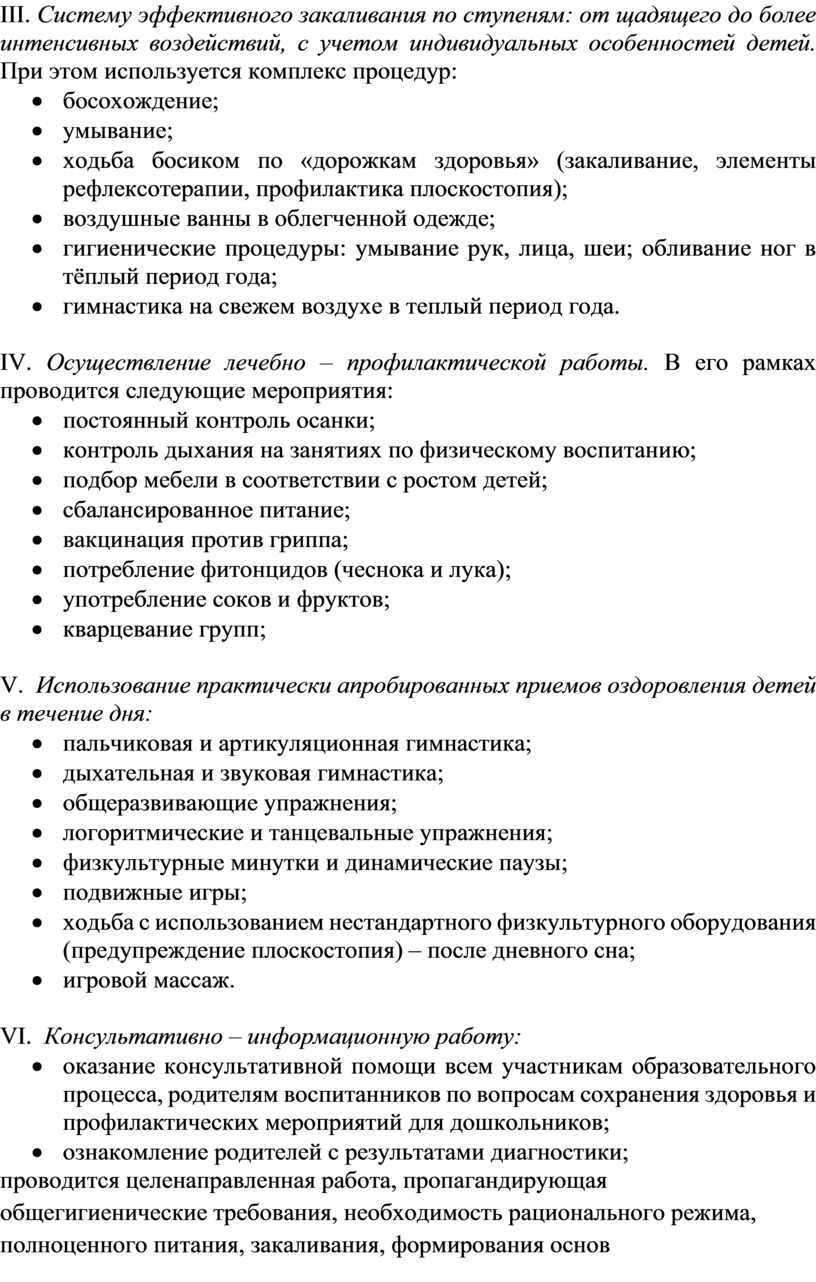 III. Систему эффективного закаливания по ступеням: от щадящего до более интенсивных воздействий, с учетом индивидуальных особенностей детей. При этом используется комплекс процедур: