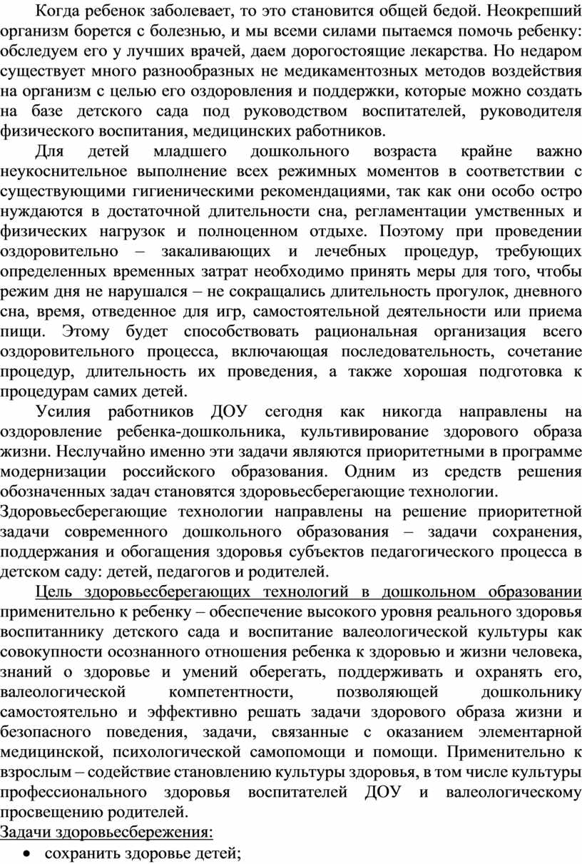 Цель здоровьесберегающих технологий в дошкольном образовании применительно к ребенку – обеспечение высокого уровня реального здоровья воспитаннику детского сада и воспитание валеологической культуры как совокупности осознанного отношения ребенка к здоровью и жизни человека, знаний о здоровье и умений оберегать, поддерживать и охранять его, валеологической компетентности, позволяющей дошкольнику самостоятельно и эффективно решать задачи здорового образа жизни и безопасного поведения, задачи, связанные с оказанием элементарной медицинской, психологической самопомощи и помощи. Применительно к взрослым – содействие становлению культуры здоровья, в том числе культуры профессионального здоровья воспитателей ДОУ и валеологическому просвещению родителей.